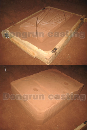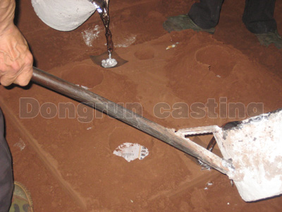 Paso 2: Moldeo en arena: Vierta el metal líquido fundido en la cavidad del molde de arena a través del puerto de drenaje, espere 5min-30min para enfriar y solidificar el metal líquido, libere el molde e ingrese al proceso posterior de triturado y recorte.