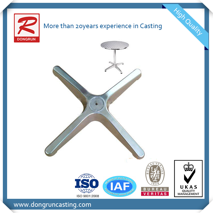 Podemos hacer base de mesa o base de silla mediante proceso de fundición de aluminio. Tenemos muchos clientes de la industria del mueble que son líderes en esa industria. Podemos hacer la base mediante un proceso de fundición, luego un alto pulido o granallado y costeo del polvo. Si necesita pulido espejo, también podemos ofrecerle la superficie. El aluminio tiene muchas ventajas, como facilidad de mecanizado, fuerte, alta relación peso-luz, estética, durabilidad y características de reciclaje. Esas características lo convierten en una opción ideal para el material de muebles de caja de cambios.